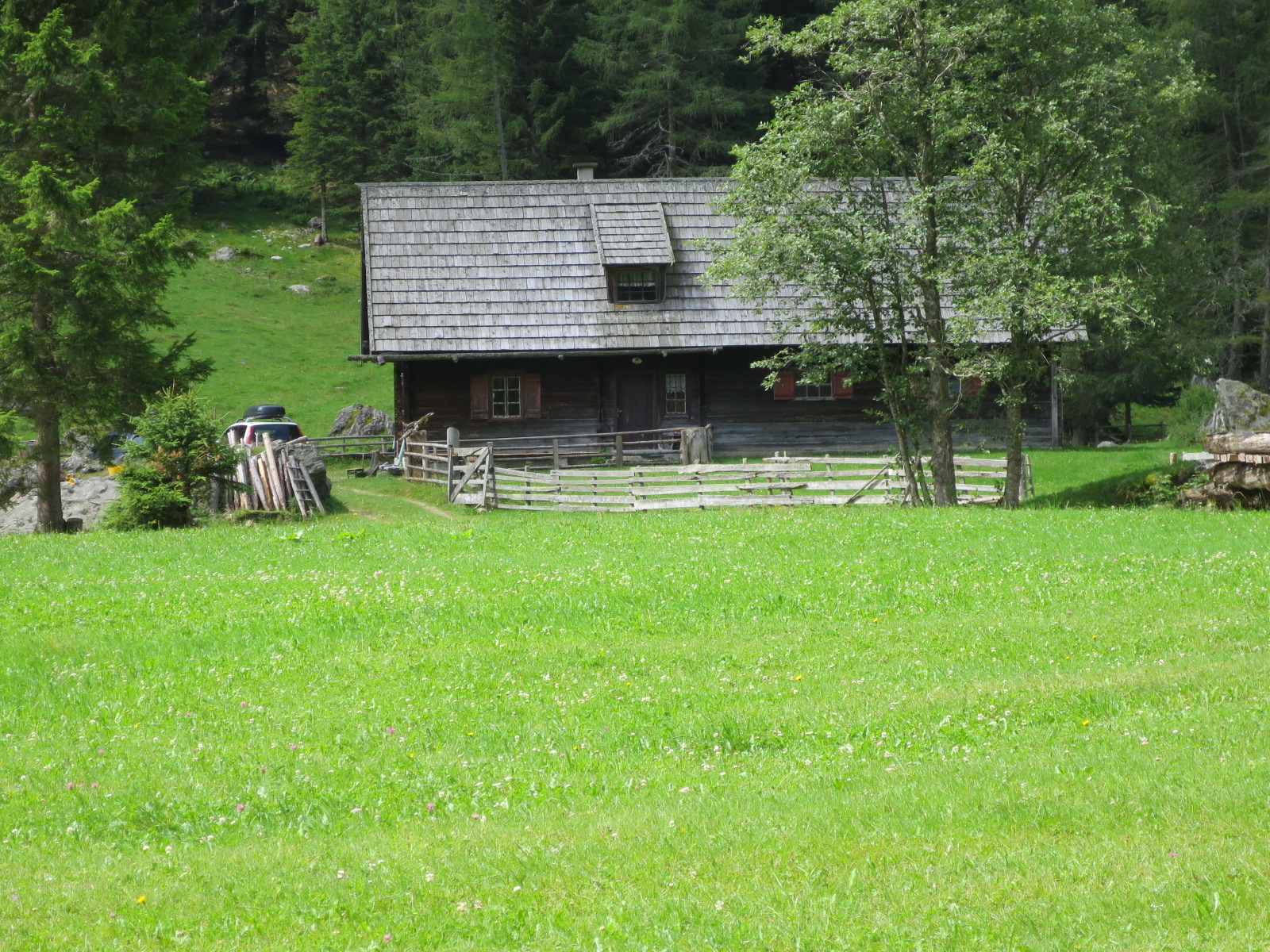 On Wednesday we had to say goodbye to Sylvia and Marianna, but were soon joined by John Grundy and Angus Tulloch, who had flown in to Salzburg and hired a car there. Again, Dicklerhütte was a priority on the agenda, and we went up to the Prebersee again, although a thunderstorm threatened to water down the wheat beer. Angus, John and I went further up the Weißpriach valley on Thursday, and John located the first hut (belonging to Herr Gahr) that housed CHV camps from 1966 until 1968. The hut is still in the family, has been spruced up, and is now rented out as a holiday home. The plan was to walk to the Oberhüttensee, but my leg was still a bit weak after a bike accident the previous year, so when we ran out of track and had to climb steeply through grass and rock, I decided to seek refuge in the nearest Jauchzenhütte. Angus and John, afraid that I would exhaust the beer supplies before they got back, were perfect gentlemen and kept me company.